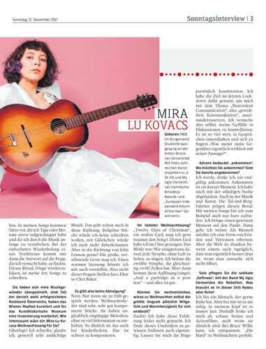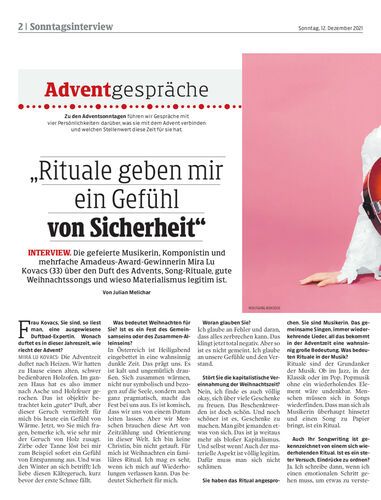 Interview. Die gefeierte Musikerin, Komponistin und mehrfache Amadeus-Award-Gewinnerin Mira Lu Kovacs (33) über den Duft des Advents, Song-Rituale, gute Weihnachtssongs und wieso Materialismus legitim ist. Von Julian Melichar