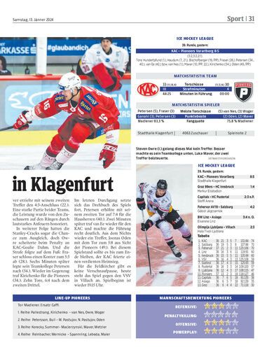 Spielbericht. Im Spiel gegen den derzeitigen Tabellenführer der ICE Hockey League konnten die Pioneers einige Zeit gut mithalten. Mit Fortdauer der Partie setzte sich aber die Qualität des KAC durch.