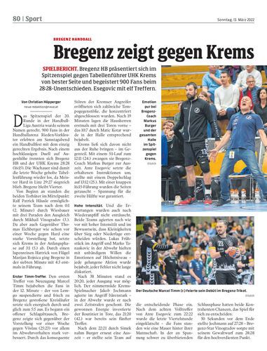 Spielbericht. Bregenz HB präsentiert sich im Spitzenspiel gegen Tabellenführer UHK Krems von bester Seite und begeistert 900 Fans beim 28:28-Unentschieden. Esegovic mit elf Treffern.