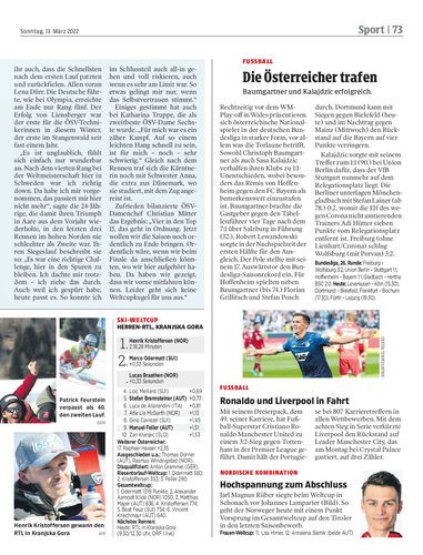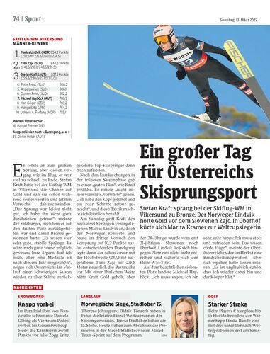 Stefan Kraft sprang bei der Skiflug-WM in Vikersund zu Bronze. Der Norweger Lindvik holte Gold vor dem Slowenen Zajc. In Oberhof kürte sich Marita Kramer zur Weltcupsiegerin.