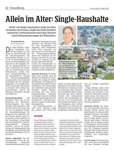Anteil von Single-Haushalten steigt im Alter, besonders bei Frauen. Studie der Stadt Dornbirn beleuchtet Lebenssituation und zeigt Chancen sowie Herausforderungen des Alleinseins.