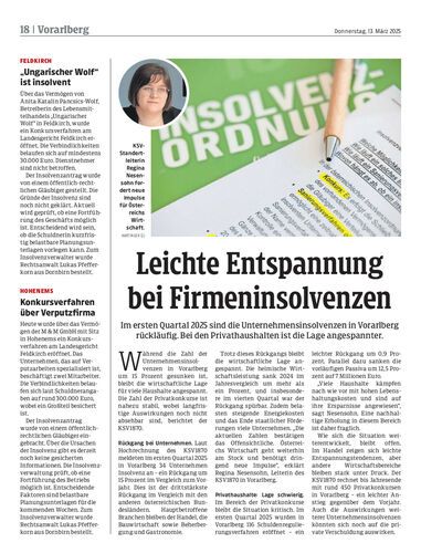 Im ersten Quartal 2025 sind die Unternehmensinsolvenzen in Vorarlberg rückläufig. Bei den Privathaushalten ist die Lage angespannter.