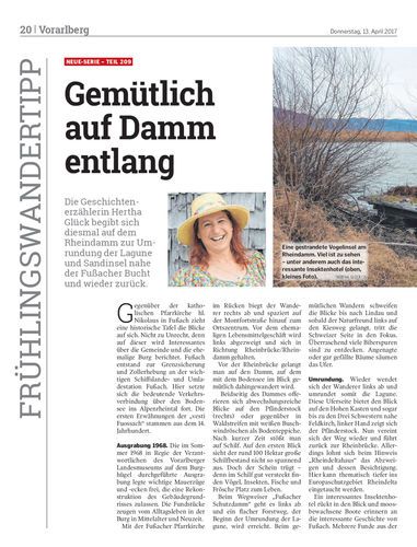 Die Geschichtenerzählerin Hertha Glück begibt sich diesmal auf dem Rheindamm zur Umrundung der Lagune und Sandinsel nahe der Fußacher Bucht und wieder zurück.