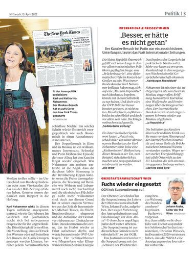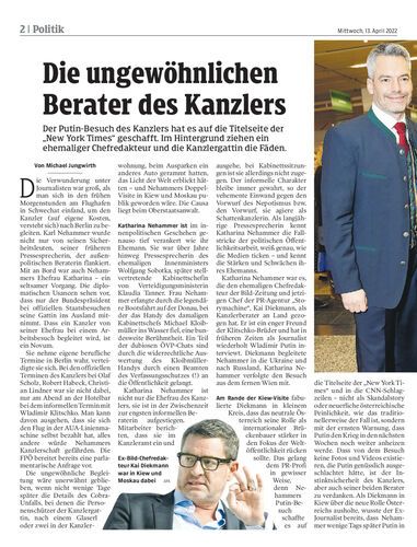 Der Putin-Besuch des Kanzlers hat es auf die Titelseite der „New York Times“ geschafft. Im Hintergrund ziehen ein ehemaliger Chefredakteur und die Kanzlergattin die Fäden.