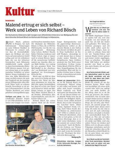 Der Kulturkreis Hohenems lädt morgen zum öffentlichen Interview von Wolfgang Ölz mit dem Künstler Richard Bösch im Kulturcafé Kitzinger in Hohenems.