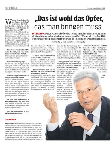 Peter Kaiser (SPÖ) wird heute im Kärntner Landtag zum dritten Mal zum Landeshauptmann gewählt. Wie er sich in der SPÖ-Führungsfrage positioniert und wie es in Kärnten weitergehen soll. Von Wolfgang Fercher und Uwe Sommersguter