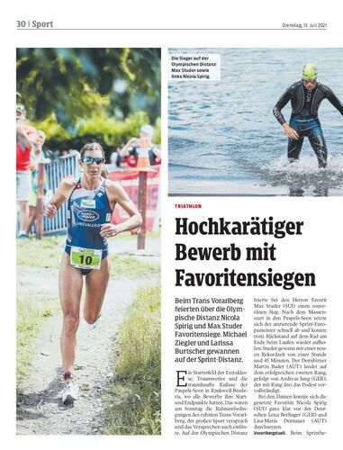Beim Trans Vorarlberg feierten über die Olympische Distanz Nicola Spirig und Max Studer Favoritensiege. Michael Ziegler und Larissa Burtscher gewannen auf der Sprint-Distanz.