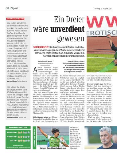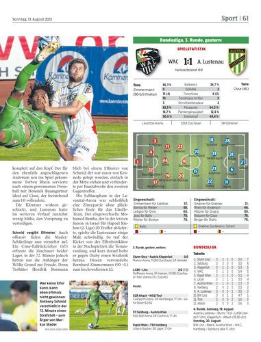 Spielbericht. Die Lustenauer lieferten in der Lavanttal-Arena gegen den WAC eine erschreckend schwache erste Halbzeit ab. Am Ende wurden in Kärnten mit einem 1:1 die Punkte geteilt.