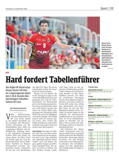Der Alpla HC Hard empfängt heute (19 Uhr) im vorgezogenen Spiel der 2. HLA-Runde den derzeitigen Tabellenführer HC Linz.