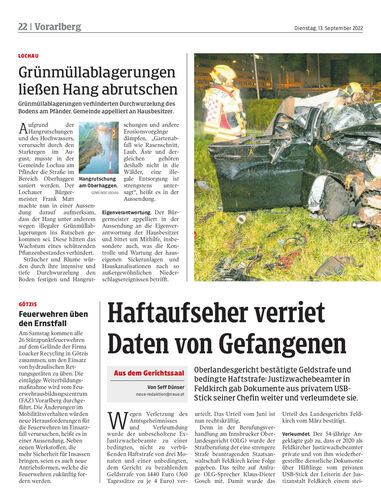 Oberlandesgericht bestätigte Geldstrafe und bedingte Haftstrafe: Justizwachebeamter in Feldkirch gab Dokumente aus privatem USB-Stick seiner Chefin weiter und verleumdete sie.