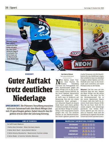 Spielbericht. Die Pioneers Vorarlberg mussten sich zum Saisonauftakt den Black Wings Linz mit 2:5 geschlagen geben. Dabei täuscht das Ergebnis etwas über die Leistung hinweg.