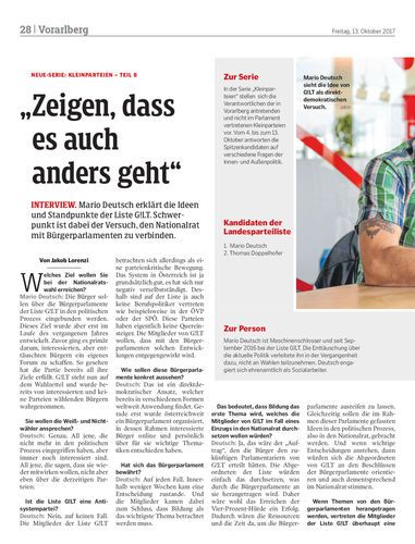 Interview. Mario Deutsch erklärt die Ideen und Standpunkte der Liste G!LT. Schwerpunkt ist dabei der Versuch, den Nationalrat mit Bürgerparlamenten zu verbinden.