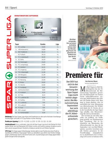Der DSV hat sich in der Gesamtwertung der Spar Super Liga noch weiter abgesetzt. Die Monatswertung September hat sich allerdings der FC Alberschwende gesichert.