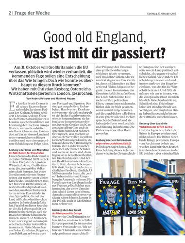 Am 31. Oktober will Großbritannien die EU verlassen, plötzlich wird wieder verhandelt, die kommenden Tage sollen eine Entscheidung über das Wie bringen. Doch wie konnte es überhaupt zu diesem Bruch kommen? Wir haben mit Christian Kesberg, Österreichs Wirtschaftsdelegiertem in London, gesprochen. Von Hubert Patterer und Manfred Neuper