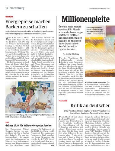 Über die Fleco Metallbau GmbH in Altach wurde ein Sanierungsverfahren eröffnet. Die Höhe der Schulden liegt bei 2,5 Millionen Euro. Grund sei der Ausfall des wichtigsten Kunden.