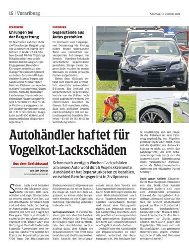 Schon nach wenigen Wochen Lackschäden am neuen Auto wohl durch Vogelexkremente. Autohändler hat Reparaturkosten zu bezahlen, entschied Berufungsgericht in Zivilprozess