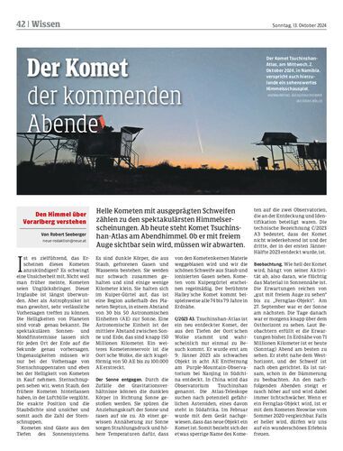 Helle Kometen mit ausgeprägten Schweifen zählen zu den spektakulärsten Himmelserscheinungen. Ab heute steht Komet Tsuchinshan-Atlas am Abendhimmel. Ob er mit freiem Auge sichtbar sein wird, müssen wir abwarten.