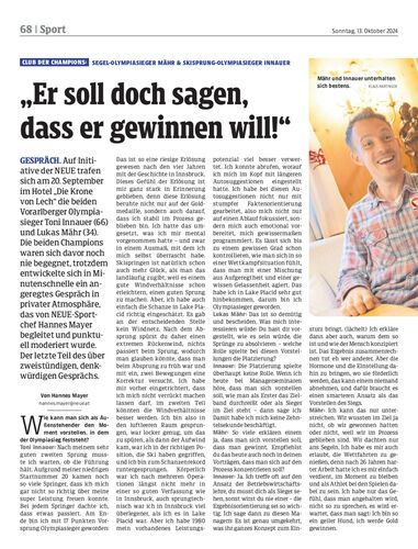Gespräch. Auf Initiative der NEUE trafen sich am 20. September im Hotel „Die Krone von Lech“ die beiden Vorarlberger Olympiasieger Toni Innauer (66) und Lukas Mähr (34). Die beiden Champions waren sich davor noch nie begegnet, trotzdem entwickelte sich in Minutenschnelle ein angeregtes Gespräch in privater Atmosphäre, das von NEUE-Sportchef Hannes Mayer begleitet und punktuell moderiert wurde. Der letzte Teil des über zweistündigen, denkwürdigen Gesprächs.