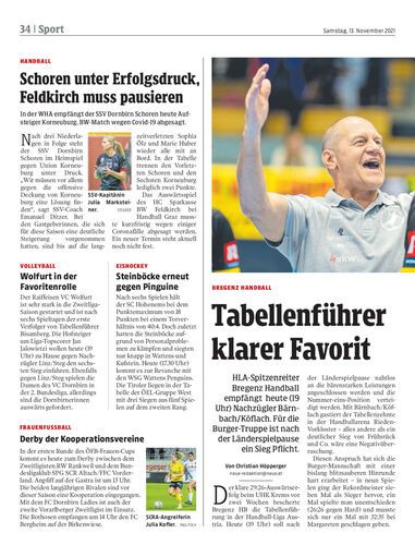 In der WHA empfängt der SSV Dornbirn Schoren heute Aufsteiger Korneuburg. BW-Match wegen Covid-19 abgesagt.