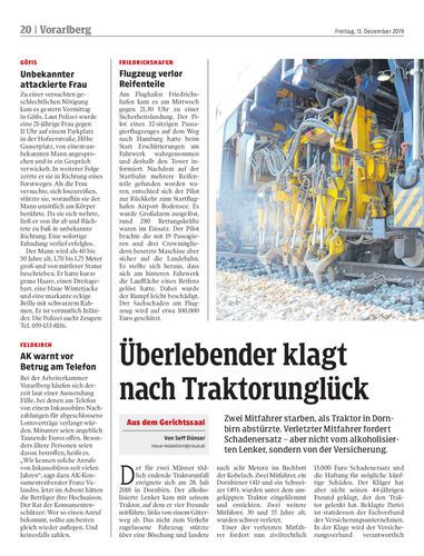 Zwei Mitfahrer starben, als Traktor in Dornbirn abstürzte. Verletzter Mitfahrer fordert Schadenersatz – aber nicht vom alkoholisierten Lenker, sondern von der Versicherung.
