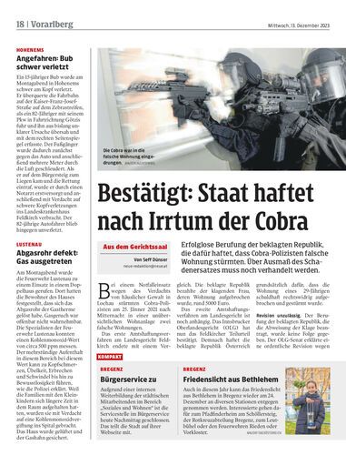 Erfolglose Berufung der beklagten Republik, die dafür haftet, dass Cobra-Polizisten falsche Wohnung stürmten. Über Ausmaß des Schadenersatzes muss noch verhandelt werden.