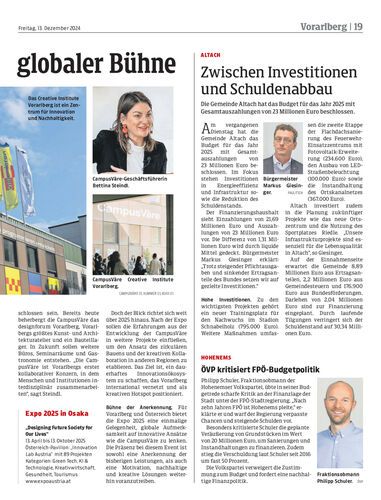 Die Gemeinde Altach hat das Budget für das Jahr 2025 mit Gesamtauszahlungen von 23 Millionen Euro beschlossen.