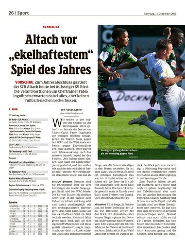 Vorschau. Zum Jahresabschluss gastiert der SCR Altach heute bei Aufsteiger SV Ried. Die Verantwortlichen um Cheftrainer Fabio Ingolitsch erwarten dabei alles, aber keinen fußballerischen Leckerbissen.