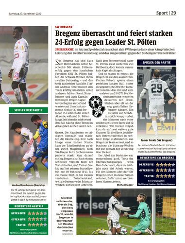 Spielbericht. Im letzten Spiel des Jahres sichert sich SW Bregenz dank einer kämpferischen Leistung den zweiten Saisonsieg, und das ausgerechnet gegen den bisherigen Tabellenführer.