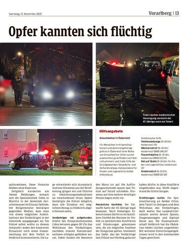 Ein 67-Jähriger ist am Donnerstagabend in Feldkirch-Gisingen durch mehrere Schüsse getötet worden. Der Tatverdächtige, ein 45-jähriger Oberländer, wurde später tot in seinem Wohnhaus aufgefunden. Polizei und Landeskriminalamt ermitteln zu Motiv, Ablauf und möglichen Hintergründen der Tat.
