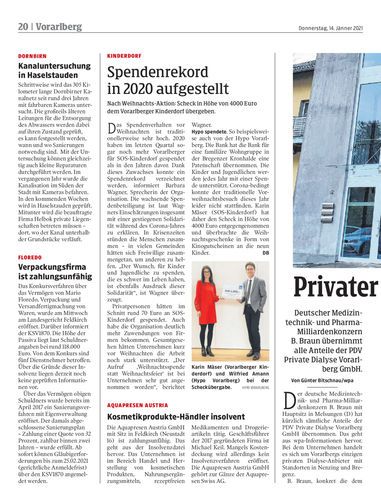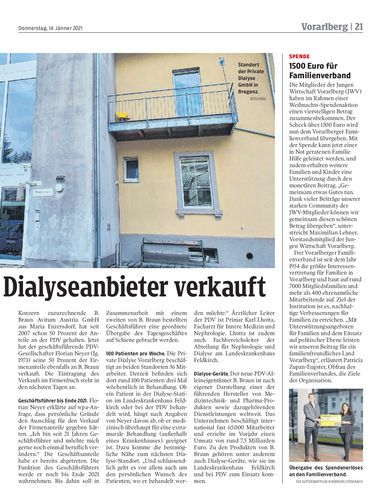 Deutscher Medizintechnik- und Pharma-Milliardenkonzern B. Braun übernimmt alle Anteile der PDV Private Dialyse Vorarlberg GmbH.