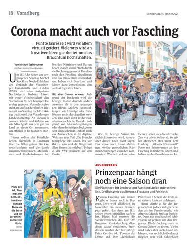 Kreative Ideen. Die Corona-Pandemie macht auch vor Vorarlbergs Narren nicht halt. Große Veranstaltungen wie etwa Umzüge sind nicht möglich. Bei der Brauchtumspflege sind heuer kreative Ideen gefragt. Seiten 18/19 Archiv/Steurer