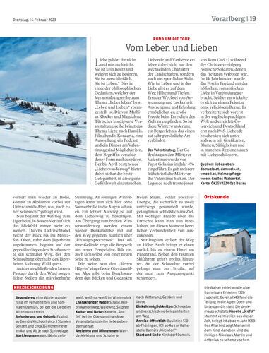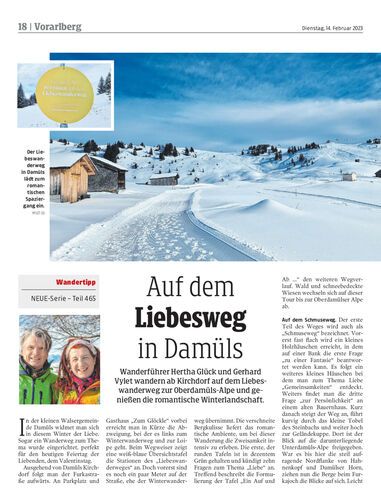 Wanderführer Hertha Glück und Gerhard Vylet wandern ab Kirchdorf auf dem Liebeswanderweg zur Oberdamüls-Alpe und genießen die romantische Winterlandschaft.