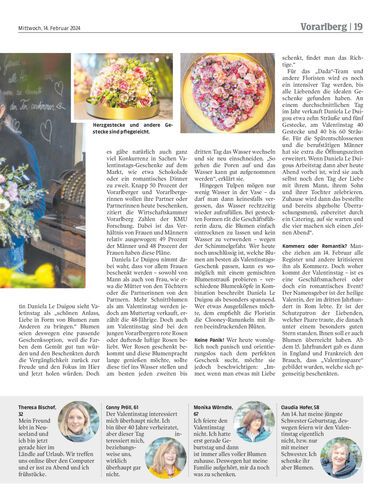Elisabeth Lenz, Blumenwerkstatt Valentinstag ist ein Blumentag. Ich bin froh, wenn der anstrengende Tag wieder vorbei ist. Floristinnen bekommen aber selbst auch gerne Blumen.