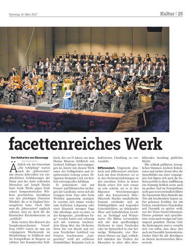 Beim Abo-Konzert des SOV waren unter der Leitung von Benjamin Lack wunderbar farbenreiche Aufführungen von Joseph Haydns „Die Jahreszeiten“ zu erleben – im Zusammenwirken von Orchester, Kammerchor Feldkirch und drei überzeugenden Solisten.