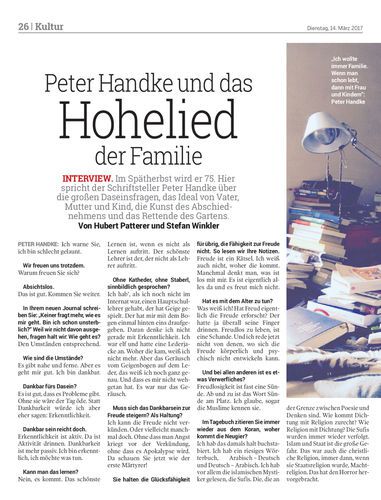 Interview. Im Spätherbst wird er 75. Hier spricht der Schriftsteller Peter Handke über die großen Daseinsfragen, das Ideal von Vater, Mutter und Kind, die Kunst des Abschied- nehmens und das Rettende des Gartens. Von Hubert Patterer und Stefan Winkler