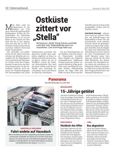 Wintersturm „Stella“ bringt Schnee und Kälte nach New York. Wetterbehörde warnt vor Autofahrten. Zwei AUA-Flüge fallen aus.