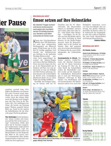 Die Jakubec-Truppe rechnet sich heute im Herrenried auch gegen den zweitplatzierten SV Grödig Chancen aus. Dornbirn und Alberschwende im Tiroler Land.