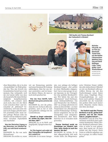 Thomas Bernhard kaufte einst in Ohlsdorf einen Vierkanthof. Zwei Filmemacher nähern sich dem Dichter an – über die Menschen des Dorfes und deren Erinnerungen an ihn. Von Luigi Heinrich