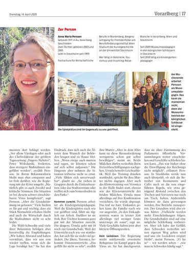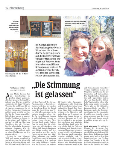 Im Kampf gegen die Ausbreitung des Corona-Virus baut die schwedische Regierung stark auf die Eigenverantwortung der Menschen. Weniger auf Verbote. Anna Maria Persson (49) aus Schoppernau lebt seit 21 Jahren dort. Sie berichtet, dass die Menschen relativ entspannt sind.