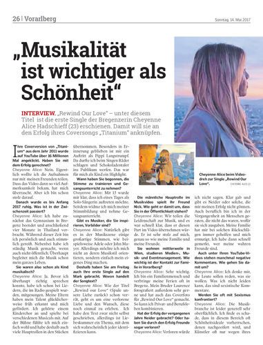 Interview. „Rewind Our Love“ – unter diesem Titel ist die erste Single der Bregenzerin Cheyenne Alice Hadschieff (23) erschienen. Damit will sie an den Erfolg ihres Coversongs „Titanium“ anknüpfen.