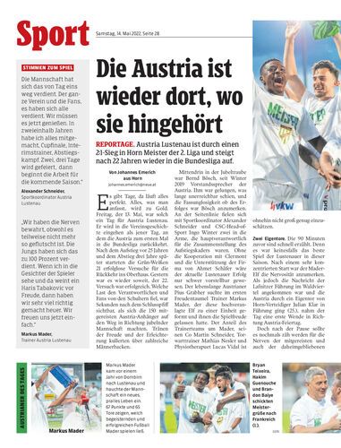 Reportage. Austria Lustenau ist durch einen 2:1-Sieg in Horn Meister der 2. Liga und steigt nach 22 Jahren wieder in die Bundesliga auf.