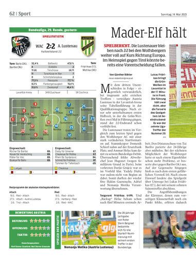 Spielbericht. Die Lustenauer bleiben nach 2:2 bei den Wolfsbergern weiter voll auf Kurs Richtung Europa. Im Heimspiel gegen Tirol könnte bereits eine Vorentscheidung fallen.