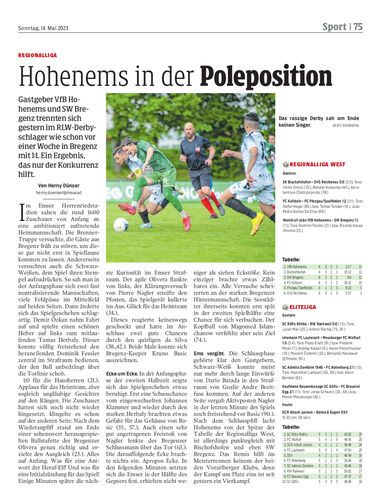 Gastgeber VfB Hohenems und SW Bregenz trennten sich gestern im RLW-Derbyschlager wie schon vor einer Woche in Bregenz mit 1:1. Ein Ergebnis, das nur der Konkurrenz hilft.