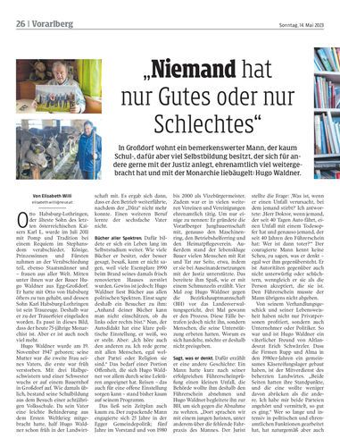 In Großdorf wohnt ein bemerkenswerter Mann, der kaum Schul-, dafür aber viel Selbstbildung besitzt, der sich für andere gerne mit der Justiz anlegt, ehrenamtlich viel weitergebracht hat und mit der Monarchie liebäugelt: Hugo Waldner.