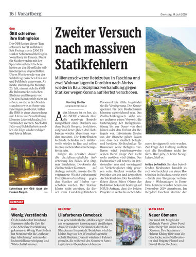 Millionenschwerer Hotelzubau in Faschina und zwei Wohnanlagen in Dornbirn nach Abriss wieder in Bau. Disziplinarverhandlung gegen Statiker wegen Corona auf Herbst verschoben.