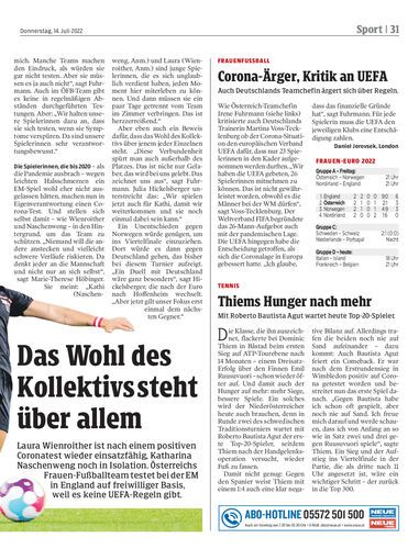 Laura Wienroither ist nach einem positiven Coronatest wieder einsatzfähig, Katharina Naschenweng noch in Isolation. Österreichs Frauen-Fußballteam testet bei der EM in England auf freiwilliger Basis, weil es keine UEFA-Regeln gibt.