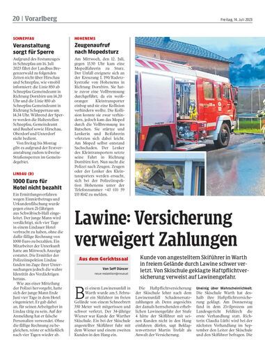 Kunde von angestelltem Skiführer in Warth in freiem Gelände durch Lawine schwer verletzt. Von Skischule geklagte Haftpflichtversicherung verweist auf Lawinengefahr.