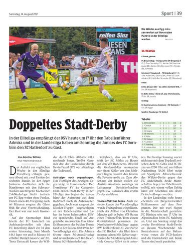 In der Eliteliga empfängt der DSV heute um 17 Uhr den Tabellenführer Admira und in der Landesliga haben am Sonntag die Juniors des FC Dornbirn den SC Hatlerdorf zu Gast.