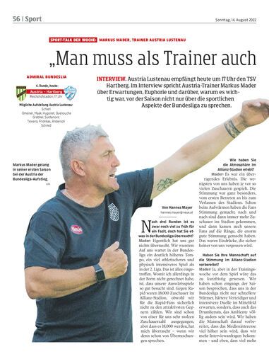 Interview. Austria Lustenau empfängt heute um 17 Uhr den TSV Hartberg. Im Interview spricht Austria-Trainer Markus Mader über Erwartungen, Euphorie und darüber, warum es wichtig war, vor der Saison nicht nur über die sportlichen Aspekte der Bundesliga zu sprechen.
