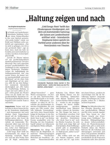 „Cold Songs: Rom“ heißt das (Shakespeare-)Großprojekt, mit dem am kommenden Samstag die Saison am Landestheater eröffnet wird – Intendantin Stephanie Gräve spricht im Vorfeld unter anderem über ihr Verständnis von Theater.